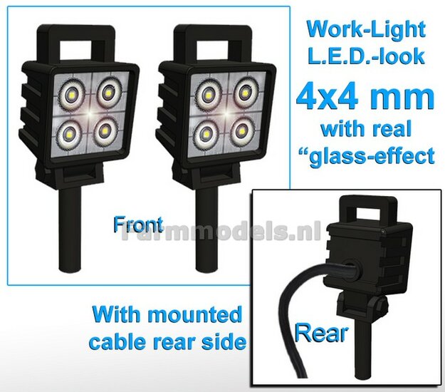 10x Werklampen (5x 462622) VIERKANT 4x4 mm, 3D L.E.D.-Look Glas effect MET Kabel, montage pen ONDERKANT (Zonder handgreep) 1:32 NB2B