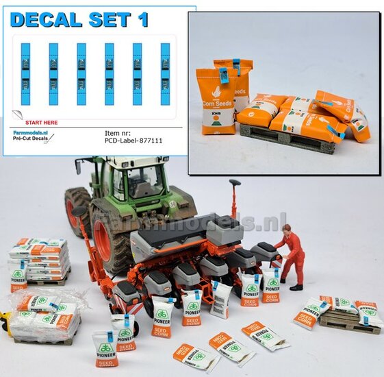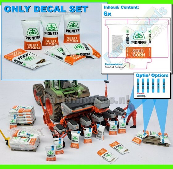 Maïszaad: PIONEER CORNSEED SET A = 5x verschillende volle zakken + 1x lege zak zaadgoed + 6x Pré-Cut decal-stickers 1:32