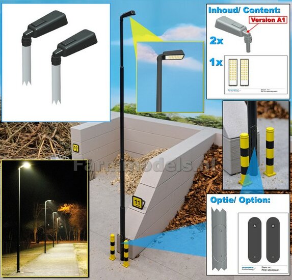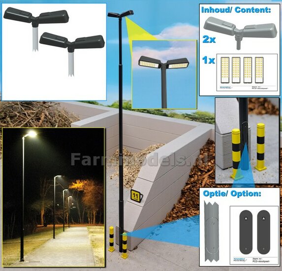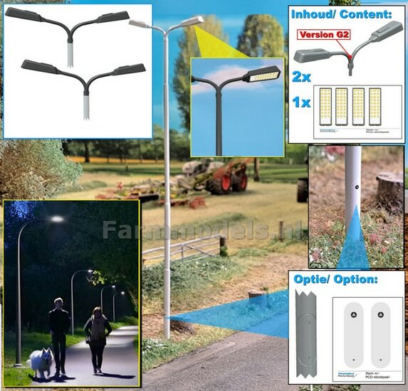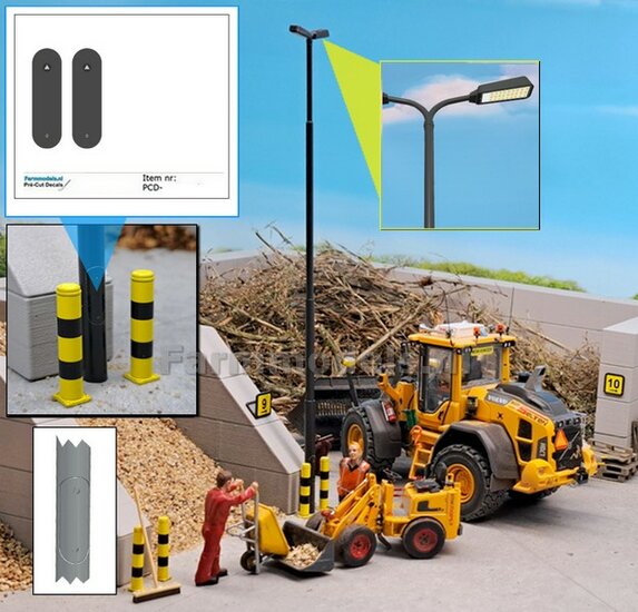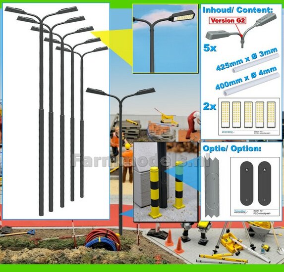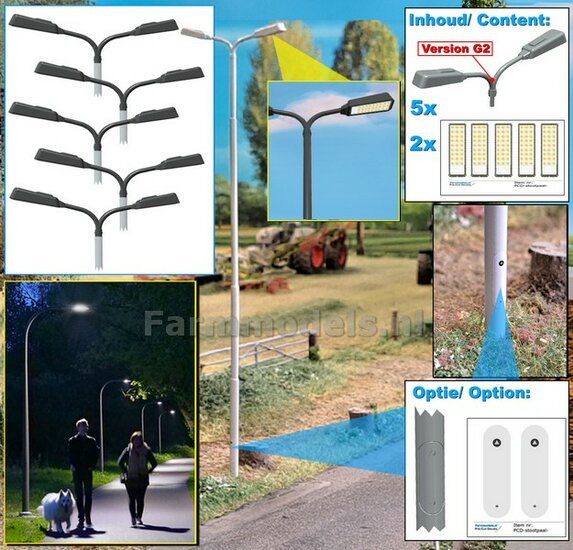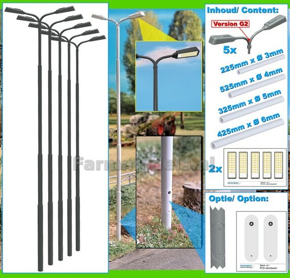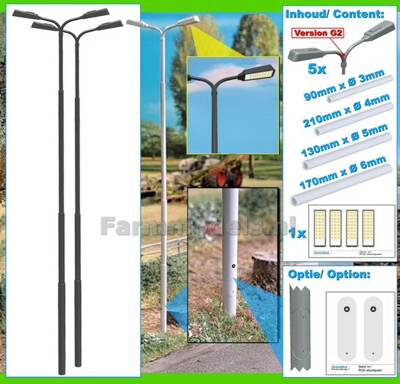 BOUWKIT: 5x DUBBEL VERLICHTINGS ARMATUUR VERSIE G2 + LANTAARNPALEN 288mm + 10x Pré-Cut Decals LED VERLICHTING 1:32