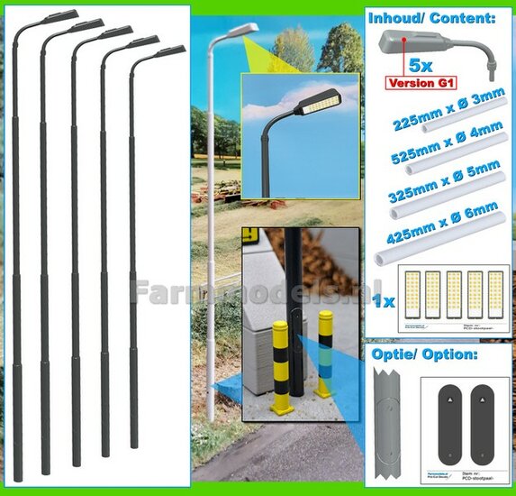 BOUWKIT: 5x ENKEL VERLICHTINGS ARMATUUR VERSIE G1 + LANTAARNPALEN 298mm + 5x Pré-Cut Decals LED VERLICHTING 1:32